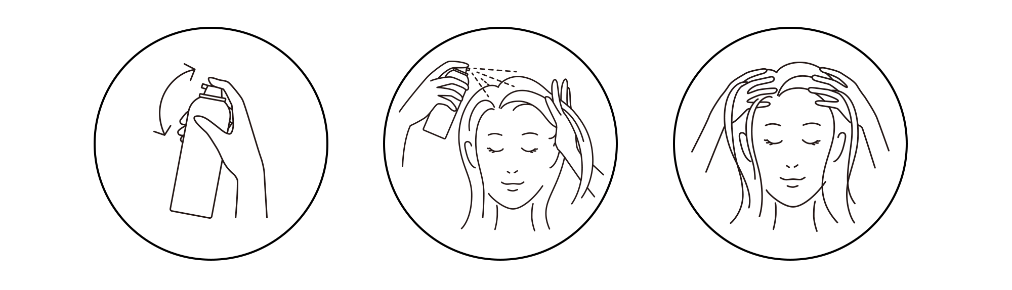 15~20cmはなし、 髪を小分けにしながら頭皮、髪の根元に向かって適量をスプレーします。