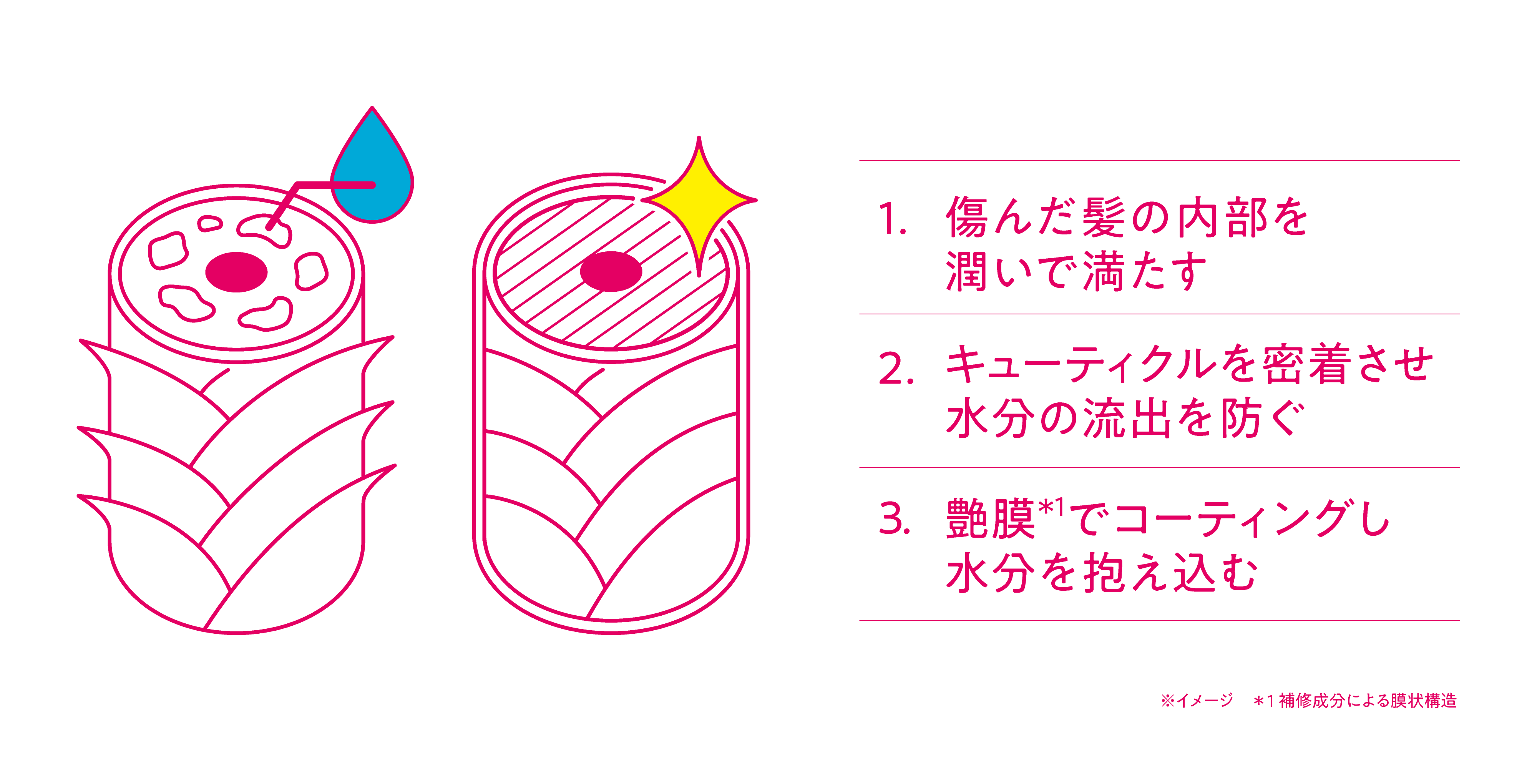 うるおいに⽋かすことのできない⾼い保⽔⼒をもつ「⽣コラーゲン*」を配合。髪の1本1本を丁寧に包み込んで剥がれたキューティクルを補修。⽑先まで潤いで満たし、みずみずしい透明感のある輝きを与えます。髪にとって必要な脂質・⽔分・タンパク質のバランスに着目したケアで、髪の内側と外側の両⽅からダメージにアプローチします。