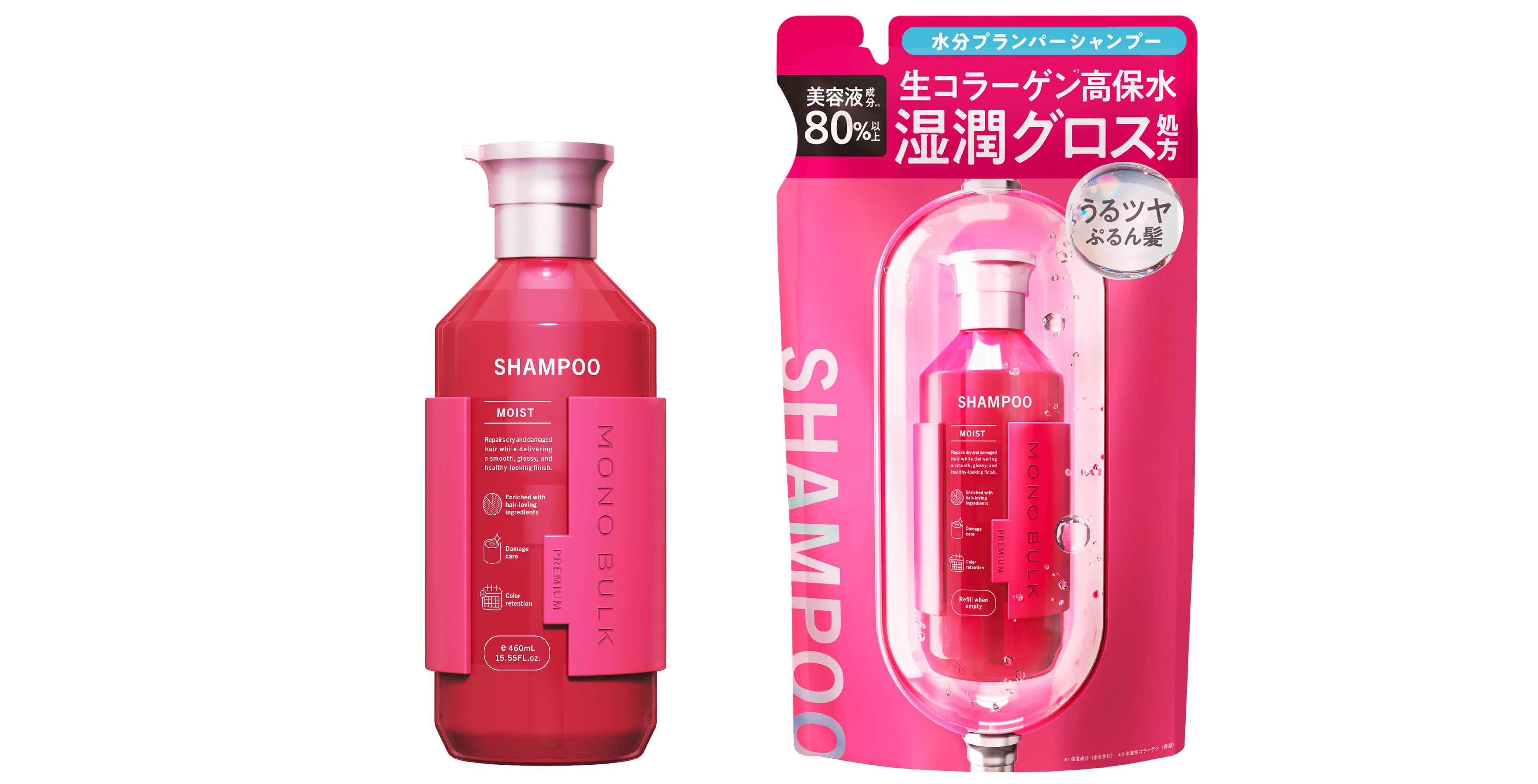 生コラーゲン*の潤い艶膜*¹で包んで、髪の内部も外部ダメージも補修する湿潤グロス処方。毛先まで潤いで満たして、透明グロスの艶を与える水分プランパーシャンプー「MONO BULK(モノバルク)」新登場!