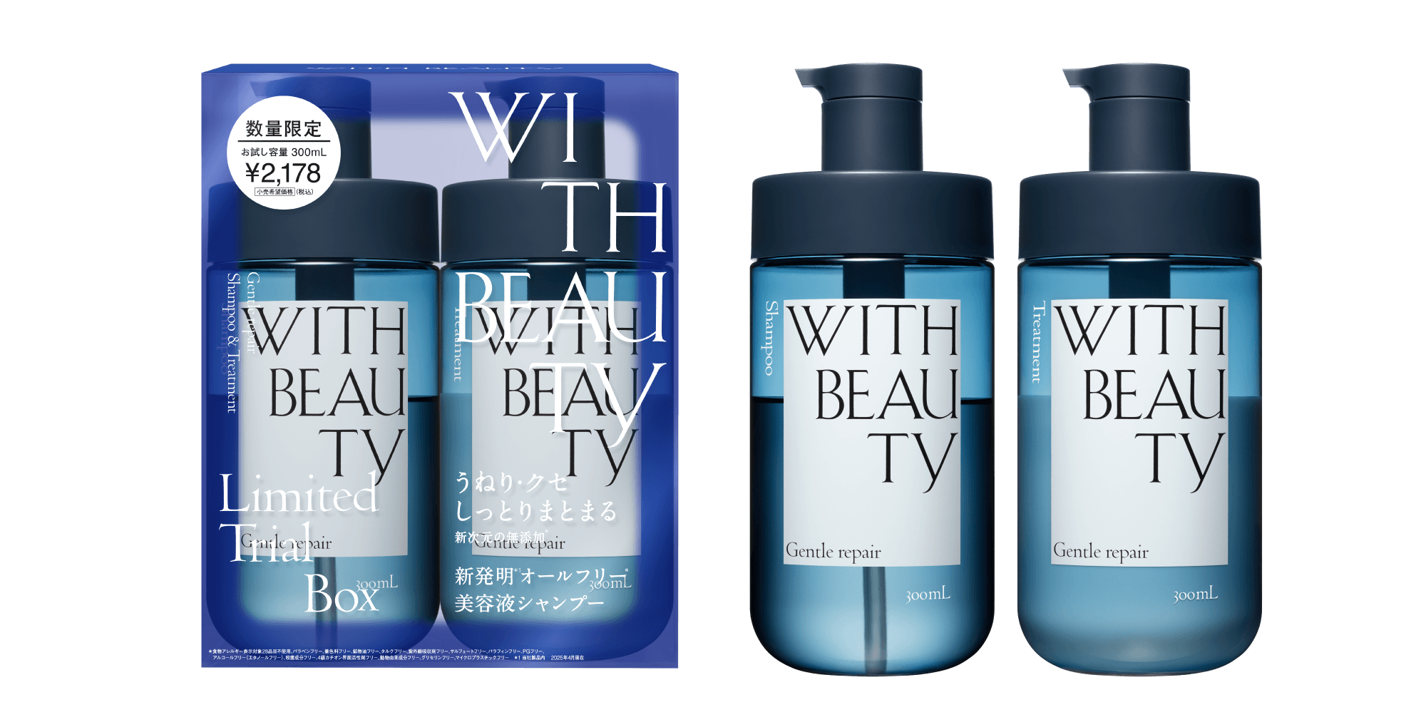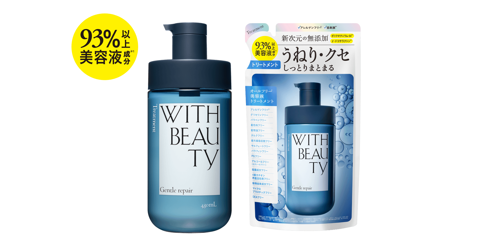*食物アレルギー表示対象28品目不使用、パラベンフリー、着色料フリー、鉱物油フリー、タルクフリー、紫外線吸収剤フリー、サルフェートフリー、パラフィンフリー、PGフリー、アルコールフリー(エタノールフリー)、殺菌成分フリー、4級カチオン界面活性剤フリー、動物由来成分フリー、グリセリンフリー、マイクロプラスチックフリー *1 保湿成分(水を含む) *2 2024.11.28~2024.11.30 株式会社アンビルト調べ。全国在住の20~54歳女性10,000人へのアンケート調査。総務省統計局「人口推計」を基に、5歳刻み年代構成比に合わせて回収し、拡大推計 *3 食物アレルギー表示対象28品目、パラベン、着色料、鉱物油、タルク、紫外線吸収剤、サルフェート、パラフィン、PG、アルコール(エタノール)、殺菌成分、4級カチオン界面活性剤、マイクロプラスチック、DEA(ウィズビューティ ジェントルリペア モイスト ヘアトリートメント)/すべての方にアレルギー・肌トラブル・肌刺激が起こらないということではありません(すべての方に刺激があるというわけではありません) *4 当社製品比 *5 パッチテスト済み/すべての方にアレルギー・肌トラブル・肌刺激が起こらないということではありません *6パッチテスト、敏感肌パッチテスト、RIPT試験(アレルギーテスト)/すべての方にアレルギー・肌トラブル・肌刺激が起こらないということではありません *7 髪内部のダメージのこと *8 セラミドNP、セラミドNG、セラミドAP、フィトスフィンゴシン *9 頭皮の角質層の水分を保ちながら保護する機能 *10 α-グルカンオリゴサッカリド *11 エンテロコッカスフェカリス *12 ラウロイルメチルアラニンNa、ココイルグルタミン酸TEA、ココイルグリシンK
